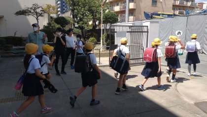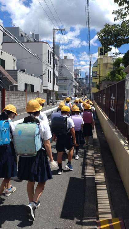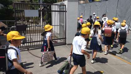 8月25日(金)、本日、避難訓練・集団下校がありました。台風接近に伴う「暴風雨警報発令」時の設定で、集団下校を実施しました。写真は、地域ごとに、先生の引率で集団下校する正門での子どもたちの様子です。