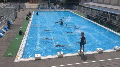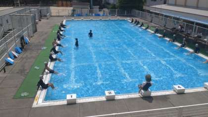 4時限目は、6年1組のプールです。クロールの練習や平泳ぎの足の使い方をプールサイドで練習しています。気温も高くなり、プール水泳中も水分補給をしなから取り組んでいます。
