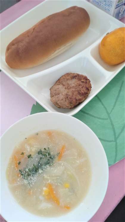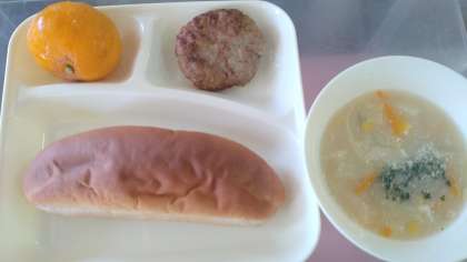今日の給食は、焼きハンバーグ、豆乳スープ、みかん(冷)、黒糖パン、牛乳です。