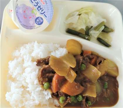 今日の給食は、ビーフカレーライス(米粉)、野菜のピクルス、ぶどうゼリー、牛乳です。
