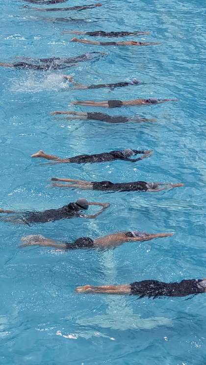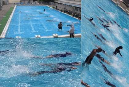 4限目は、5年1組のプールでした。クロールの練習をしました。プールの横を、息づぎに気をつけて泳いでいます。