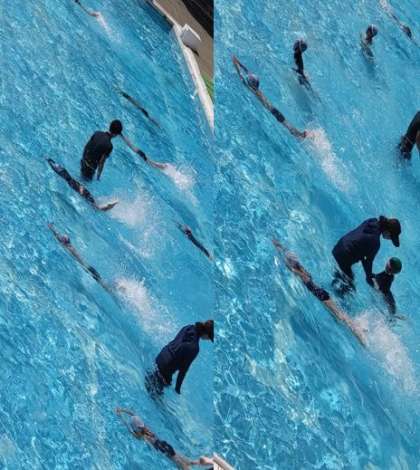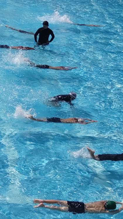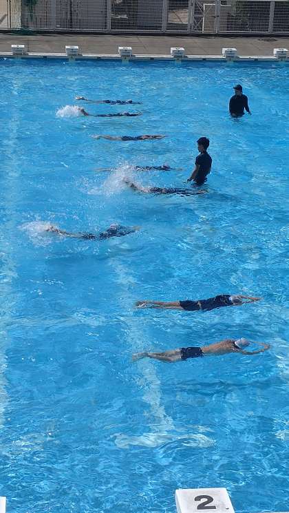 3限目に、3年1組のプールがありました。けのびから伏し浮き、バタ足までの泳ぎをスムーズにできるように練習しています。