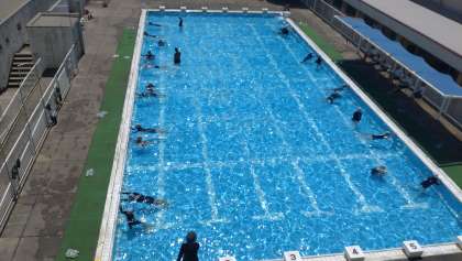 4限目は、6年2組のプールでした。写真は、平泳ぎの足の使い方をプールサイドの壁をもって練習している様子です。