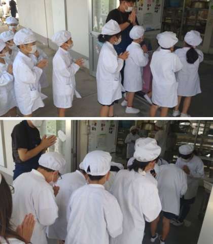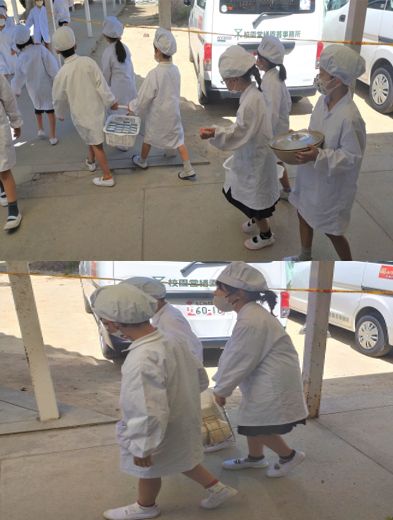給食の時間に、給食当番が給食室から食缶や食器かご、牛乳などを丁寧に運んでいます。「いただきます」の挨拶もしっかりとしています。1年生と3年生の給食当番の様子です。どの学年の給食当番の子どもたちも毎日頑張っています。