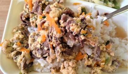 他人丼は、鶏肉以外の肉(牛肉や豚肉など)とたまねぎを甘く煮たものを、卵でとじてごはんの上にのせた料理です。