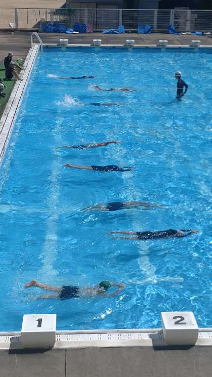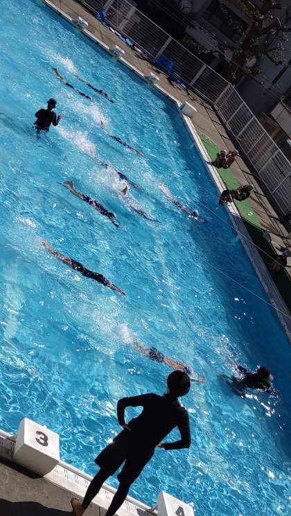 強い日差しの中、今日も各学年でプール水泳がありました。写真は、3年生のプールでの様子です。子どもたちは「けのび」や「伏し浮き」「バタ足」がたいへん上手になりました。
