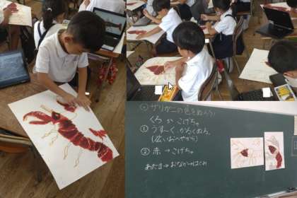 2年生が、図画工作でザリガニを描写しています。画用紙いっぱいに、大きなはさみをもったザリガニを描き、絵の具で色を塗りました。