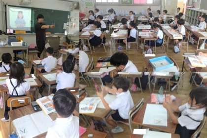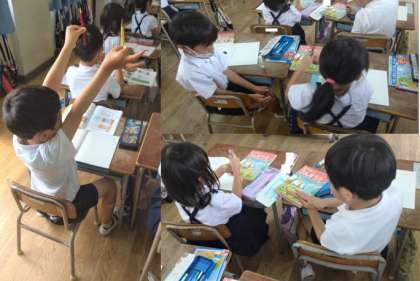 1年生が算数で、「おおきさくらべ」の学習をしました。この時間は「ながさくらべ」の学習で、鉛筆を実際に使って、直接比較を用いて長さを比べることを学んでいます。