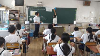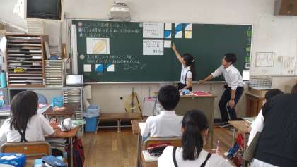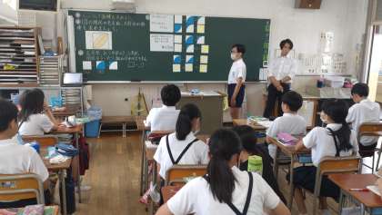 自分の考えを全体で交流しました。いずれの求め方もこれまでの学習の公式を使い、円弧を含む複合図形の面積の求め方を説明しています。