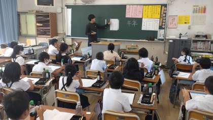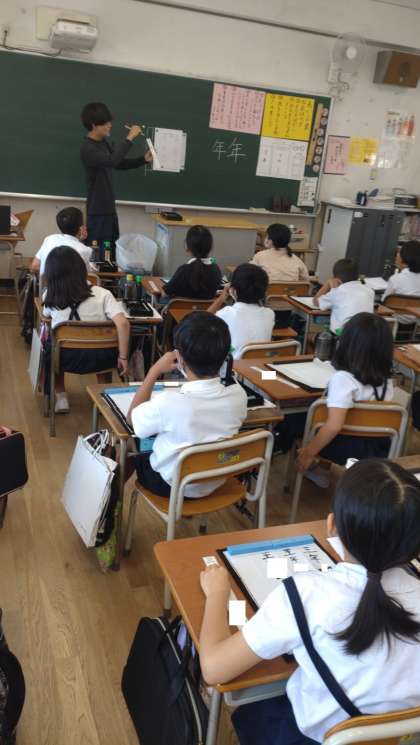 3年生が毛筆書写に取り組んでいます。この時間は、学年・組・名前などの書き方を学んでいます。