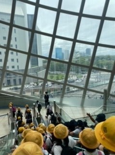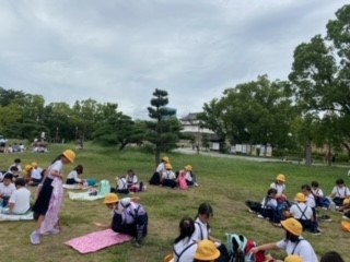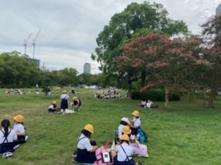 4年生が劇鑑賞の後、公園の緑の芝生で、お弁当を食べています。