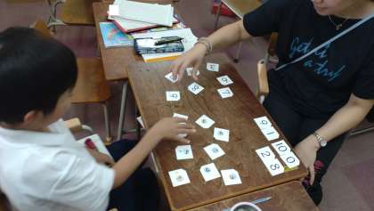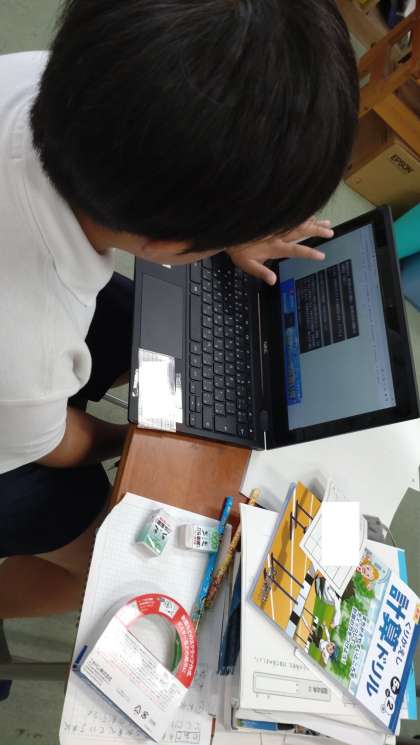 なかよし学級では、国語や算数など、それぞれの課題に取り組んでいます。カードやタブレットなどを活用して課題解決しています。