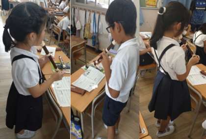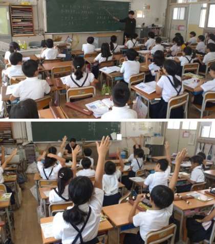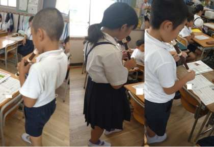3年生が、旋律の音の上がり下がりを感じ取って、強さを工夫しながらリコーダー演奏に取り組んでいます。きれいなリコーダーの音色が、教室に響いています。