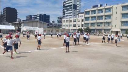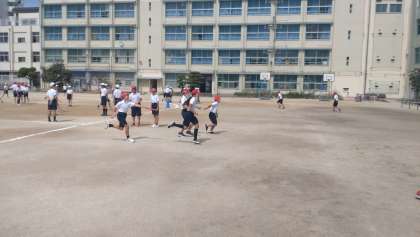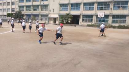 5年生が、リレーのバトンパスの練習をしました。どこを工夫すれば、スムーズにバトンを渡せるかチームで協力しながら練習に取り組んでいます。