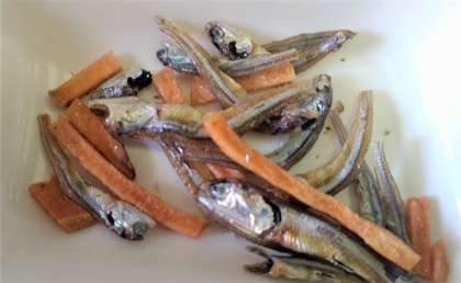 「いもけんぴフィッシュ」は、国産のかたくちいわしとさつまいもを使っています。今回、はじめて給食に登場します。歯ごたえがあるので、しっかりよくかんで食べましょう。