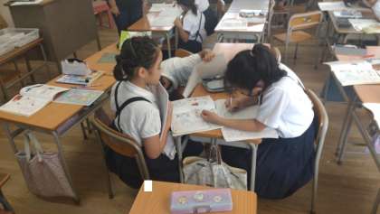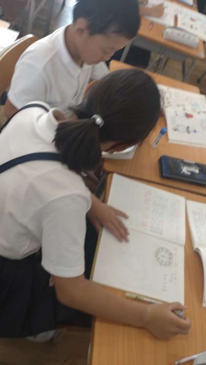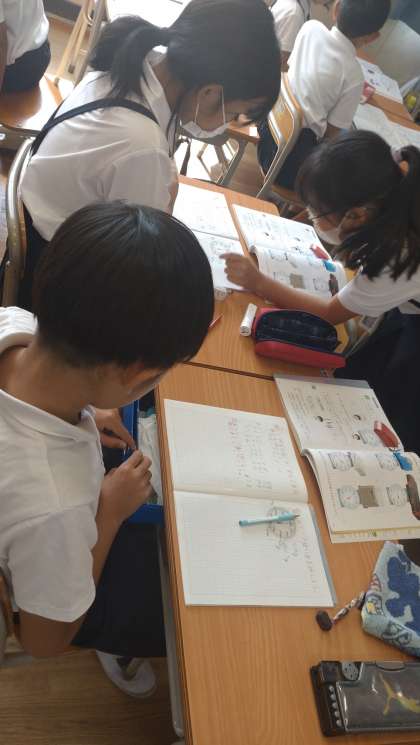 3年生が算数で「重さ」の学習に取り組んでいます。重さの単位 g について知り、gを使って重さを表すことを学んでいます。写真は、ペアやグループで学習している様子です。