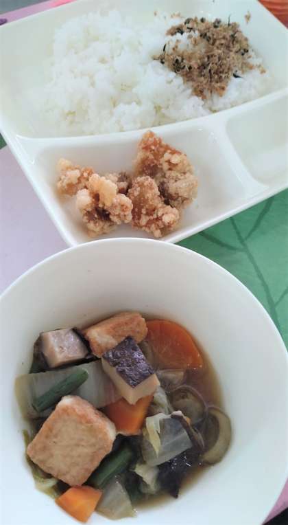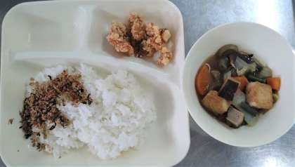 今日の給食は、鶏肉のたつたあげ、あつあげと野菜の煮もの、おかかなっ葉、ごはん、牛乳です。