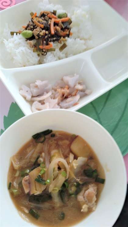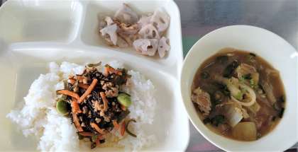 今日の給食は、もずくとひき肉のジューシー、さつまいものみそ汁、焼きれんこん、牛乳です。
