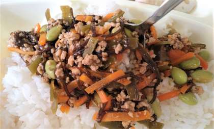 ジューシーには、豚肉やひじきなどを使った沖縄風たきこみごはんと沖縄風ぞうすいの2種類があります。
