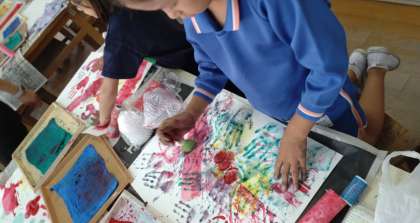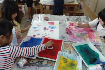 子どもたちは、いろいろな色や形を工夫して作品をつくっています。