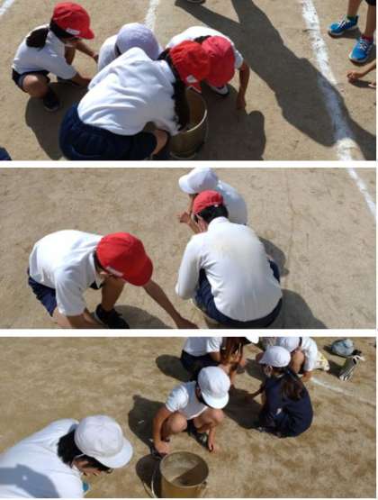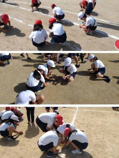 全体練習の後、全学年で小石ひろいをしました。子どもたちは運動場の小石をとても熱心にひろっています。