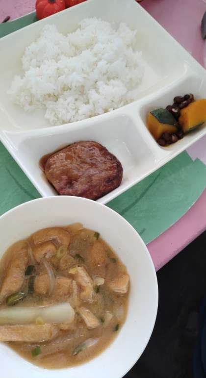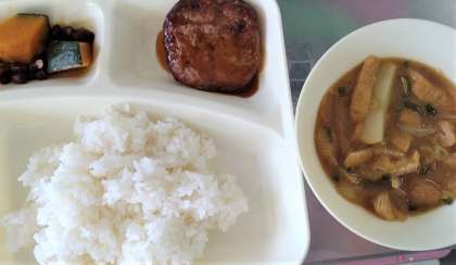 今日の給食は、和風ハンバーグ、みそ汁、かぼちゃのいとこ煮、ごはん、牛乳です。
