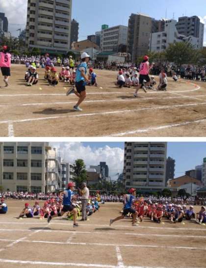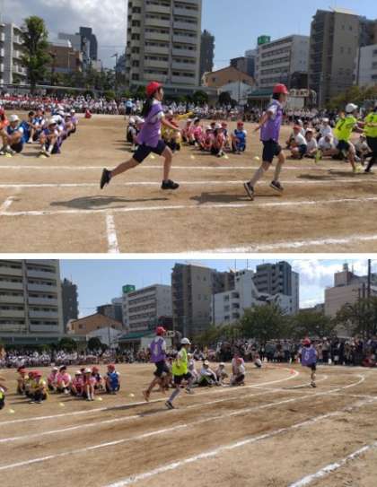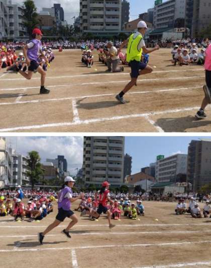 運動会では、団体演技だけでなく、個人走やリレーでも子どもたちは頑張っていました。写真は、6年のリレー「疾走 〜バトンをつないで〜」での子どもたちの様子です。