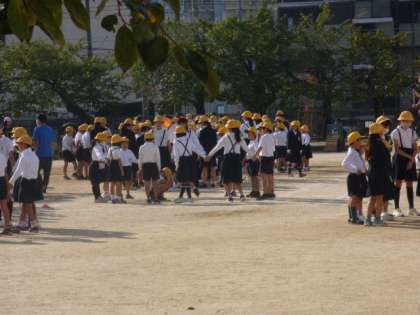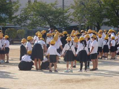 本日の児童集会は「かごめ かごめ」でした。1年から6年の児童で構成された、たてわり班で円になり、「かごめ かごめ」を3回しました。