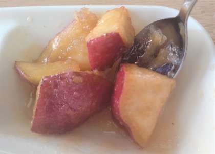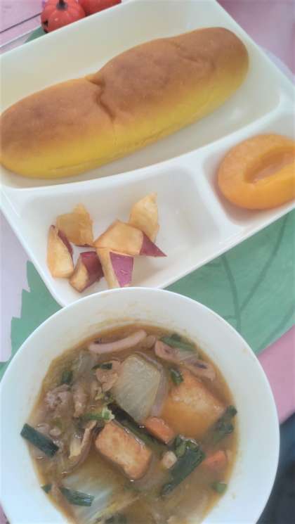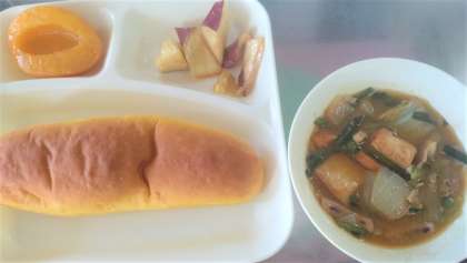 今日の給食は、豚肉といかの中華煮、大学いも、黄桃(缶)、パンプキンパン、牛乳です。