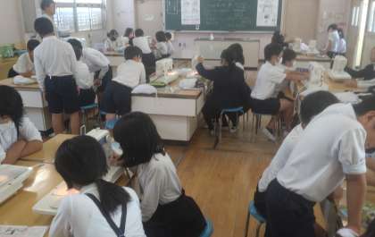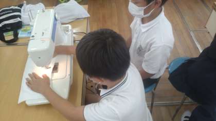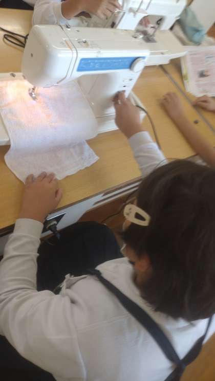 子どもたちは、上糸、下糸のかけ方を学習してから、真剣に直線縫いに取り組んでいました。