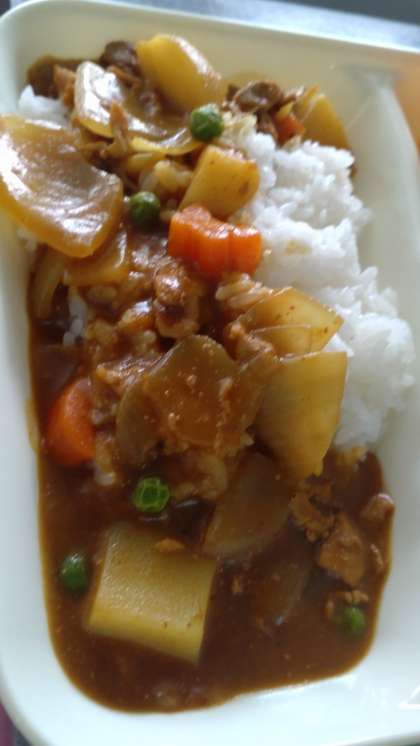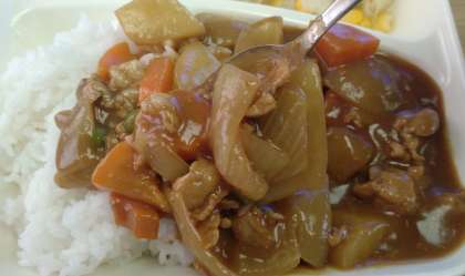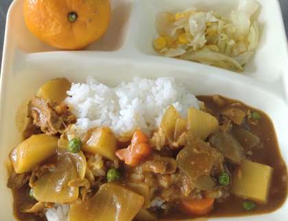 今日の給食は、ポークカレーライス(米粉)、サワーソテー、みかん、牛乳です。