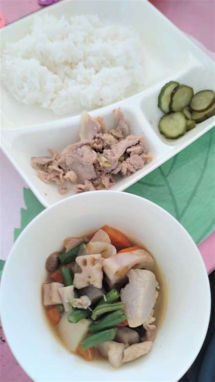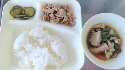 今日の給食は、豚肉のねぎじょうゆ焼き、ふきよせ煮、きゅうりの甘酢づけ、ごはん、牛乳です。