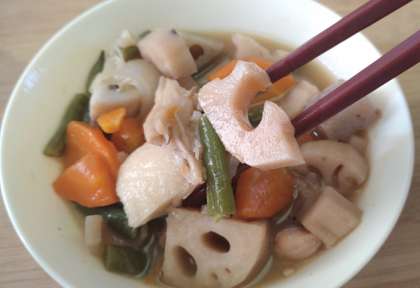 今日の給食では、さといも、れんこん、しめじを使っています。