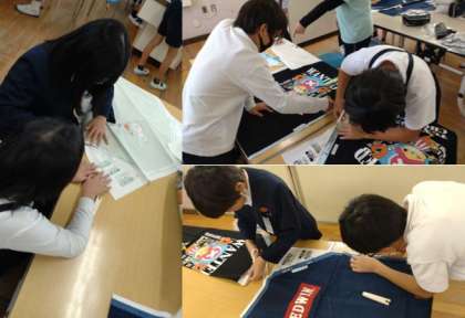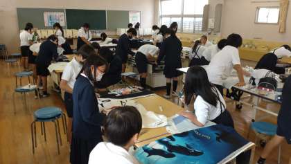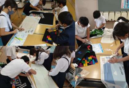 5年生が家庭科でエプロンづくりに取り組んでいます。「布をたつ」「布にしるしをつける」などの作業に真剣に集中しています。