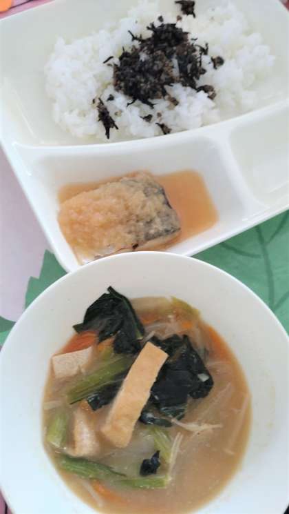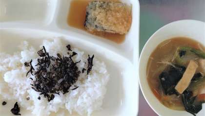 今日の給食は、さごしのみぞれかけ、みそ汁、牛ひじきそぼろ、ごはん、牛乳です。