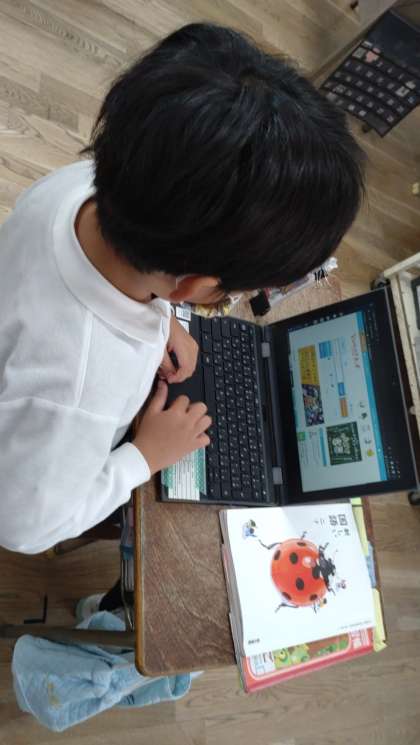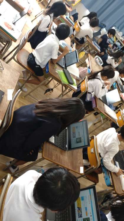2年生が説明文「ビーバーの大工事」を学習しています。この時間は、一人一台端末を活用して自分の興味のある動物を調べています。