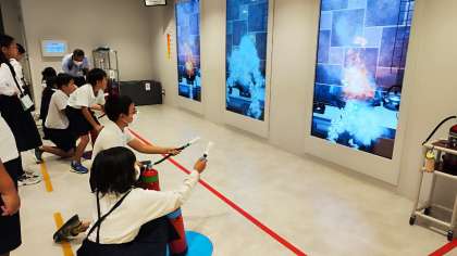 阿倍野防災センターでは、震度7体験で地震の怖さや、がれきの街で危険、消火器の使い方などたくさんの体験をしました。みんなとても真剣でした。
