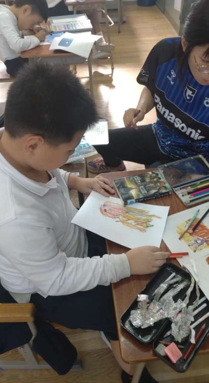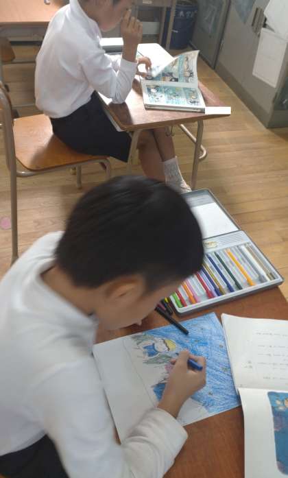なかよし学級で、物語文「サーカスのライオン」の学習をしました。文中から想像して挿絵を描いています。