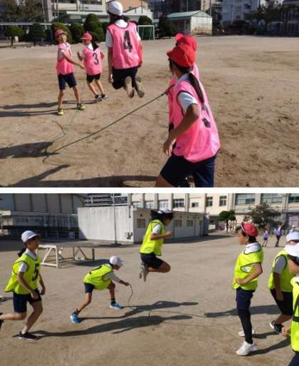 今日は、6年生の体育の公開授業もありました。体つくりの運動「巧みな動きを高める運動」で、長なわを使って運動しました。