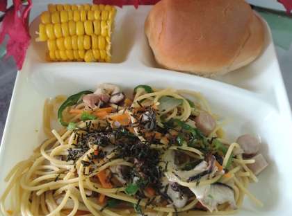 今日の給食は、ウインナーときのこの和風スパゲティ、焼きとうもろこし、固形チーズ、黒糖パン1/2、牛乳です。