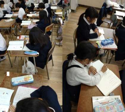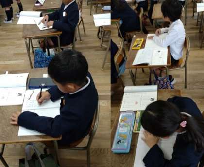 2年生が国語の時間に、漢字の学習に取り組んでいます。これまでに習った漢字や熟語を振り返って丁寧に書いています。