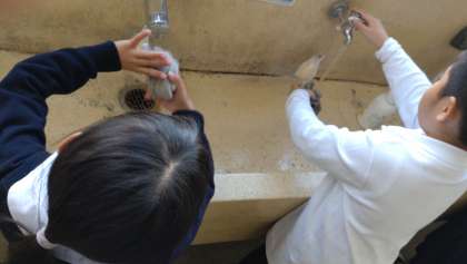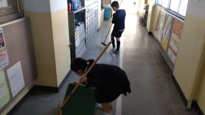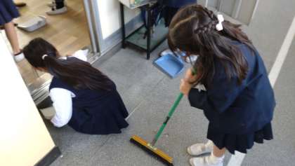 清掃の時間に、子どもたちは教室や廊下など各担当の場所で一生懸命に清掃活動を頑張っています。今日は雨も降っていたので、砂や土も多かったのですが、とても熱心に活動していました。