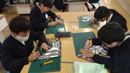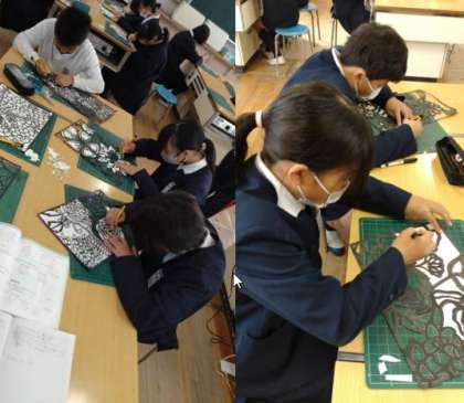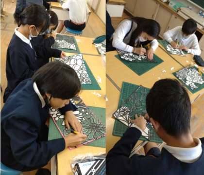 6年生が図工でステンシル版画に取り組んでいます。 厚紙にカッターで模様を現していきます。細かい作業ですが、子どもたちは集中しています。