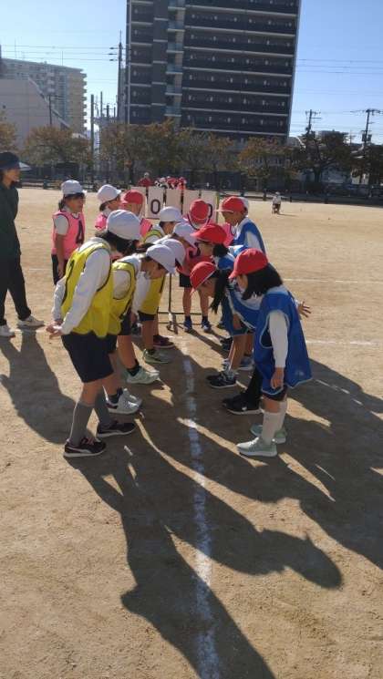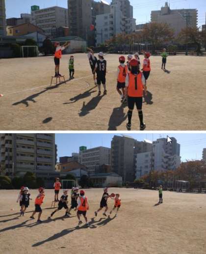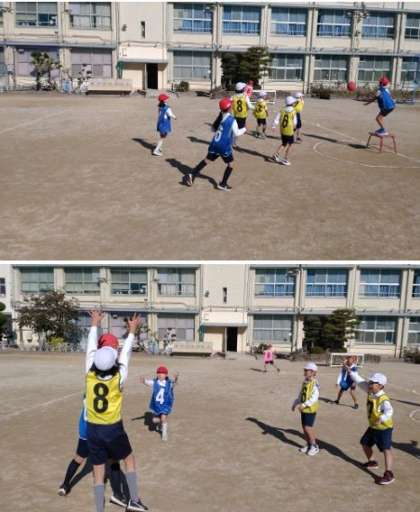 3年生が体育の時間にポートボールのゲームをしています。チーム対抗で、互いに相手チームの防御を交わしながら、協力してパスをつないでいます。ボールを運び、ゴールにシュートして得点を競い合うゲームです。子どもたちは、声をかけ合ってパスを回しています。