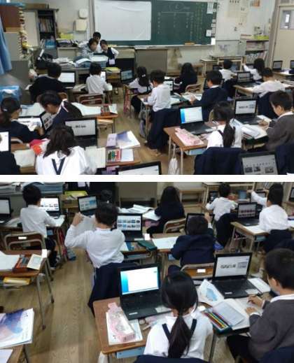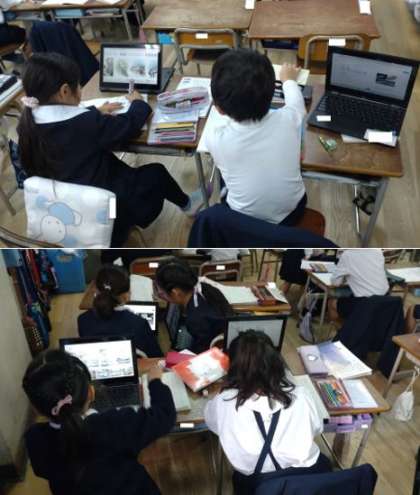 1年生が国語で「のりもののことをしらべよう」の学習をしています。一人一台端末PCを活用して、インターネットで、自分の興味のある乗り物のことを調べてカードに書いています。子どもたちは、真剣に楽しく調べています。