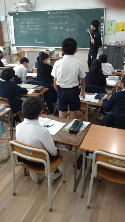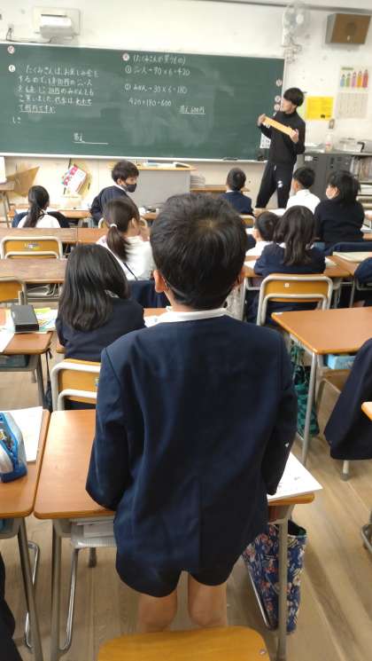 3年生の算数で「式と計算」の学習をしています。加減と乗法の混じった式について、その計算の仕方を考えたり説明したりしています。分配法則について学んでいます。