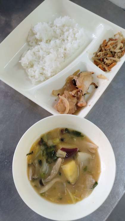 今日の給食は、体ポカポカ鶏肉のしょうが焼き、ほくほくさつまいもみそ汁、ピリッとひき肉きんぴらごぼう、ごはん、牛乳です。