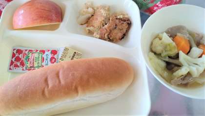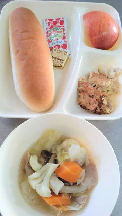 今日の給食は、とうふローフ、カリフラワーのスープ煮、りんご、コッペパン、バター、牛乳です。