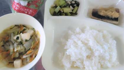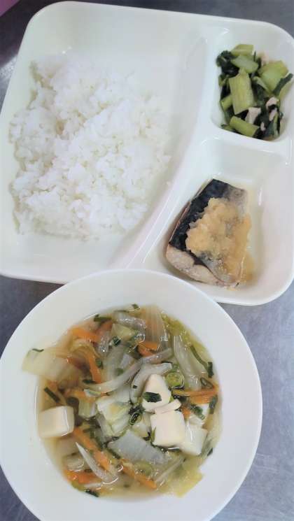 今日の給食は、さばのみぞれかけ、すまし汁、こまつなの煮びたし、ごはん、牛乳です。