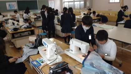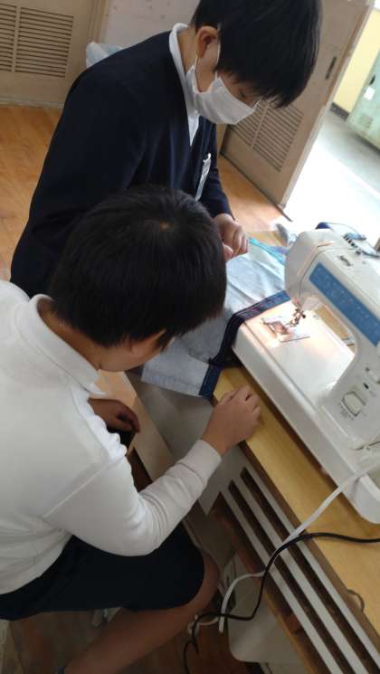 5年生が家庭科で「エプロンづくり」に取り組んでいます。友だちと協力しながらミシンを操作しています。できあがりが楽しみですね。